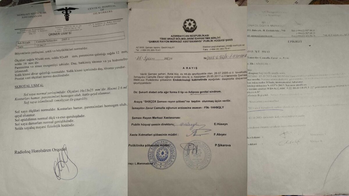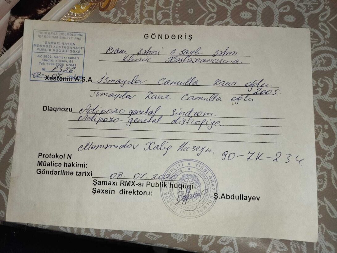 Ailəyə Şamaxı Rayon Mərkəzi Xəstəxanası tərəfindən verilən 25 iyun 2023-il tarixli arayışda da Şamaxı şəhəri, Xətai küçəsi, ev 44 ünvanda qeydiyyatda olan 2005-ci il təvəllüdlü Camulla İsmayılovun şəkərli diabet orta ağır forma II tip, Adipoza genitral sindrom diaqnozu ilə dispanserdə qeydiyyatda olduğu qeyd edilib.