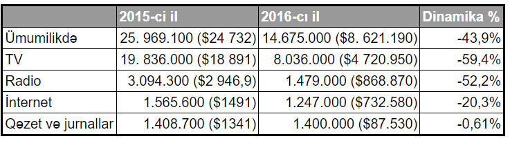 Dövlət Statisika Komitəsinin hesabatına görə, 2016-cı ildə Azərbaycan KİV-in iqtisadi tənəzzülü davam edib. Ümumilikdə KİV-in əsas leqal gəlirinin həcmi – mediareklam 43,9% azalaraq, 14.675.000 manat (8.621.190 dollar) təşkil edib.