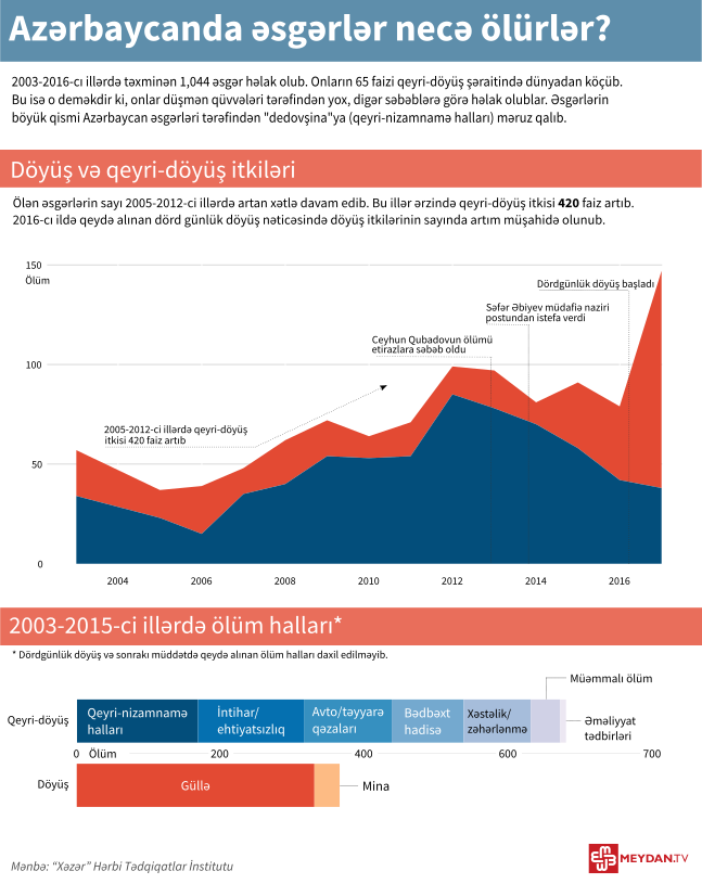 “Xəzər” Hərbi Tədqiqatlar İnstitutunun media və sosial şəbəkələrdə apardığı monitorinq əsasında hazırladığı məlumatlarda deyilir ki, 2003-2016-cı illərdə Azərbaycan ordusu 1044 əsgərini itirib: onların 30%-i döyüş, 60%-i qeyri-döyüş şəraitində dünyasını dəyişib.