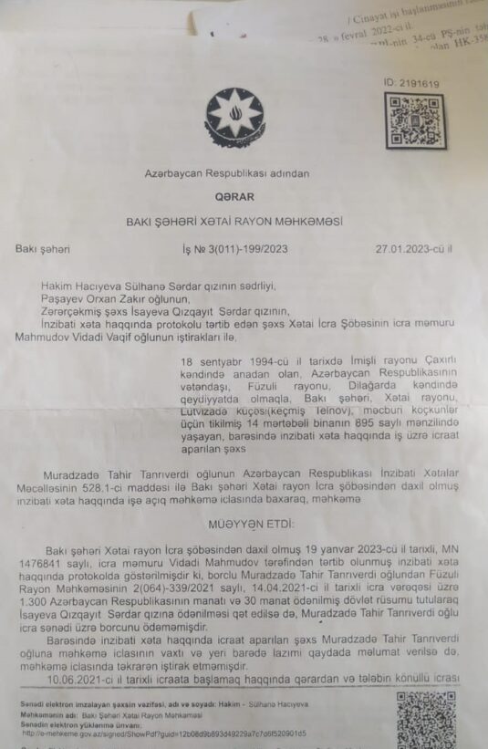 2022-ci ildə çıxarılan məhkəmə qərarından görünür ki, Tahir Muradzadənin axtarışı öncə qeydiyyatda olduğu Füzuli Rayon Polis İdarəsinə, daha sonra isə Bakıda yaşadığı üçün ötən ilin yanvarından Xətai Rayon Polis İdarəsinə həvalə edilib.