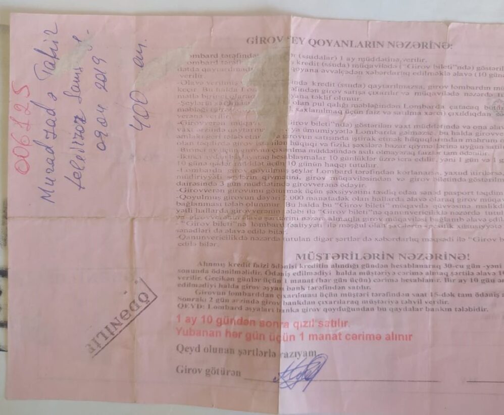 “Sonra gəlib əşyaları evimdən apardılar ki, satıb pulunu verəcəyik. Pulu soruşanda aliment kartını verdi ki, bura keçmiş həyat yoldaşı pul köçürəcək, guya ordan çıxararam. Onun da içində pul olmadı. Bir müddət qeydiyyatda olduğu Füzuli rayonu Horadiz qəsəbəsində gizləndi. Adına poçtdan məhkəmə bildirişi gələndə öyrəndim ki, digər adamlara qarşı da dələduzluq ediblər. Yəni çox adama məişət texnikasını lombarddan götüzdürüb pulunu ödətdirirlər, sonra da atıb qaçırlar”, – şikayətçi qeyd edib.