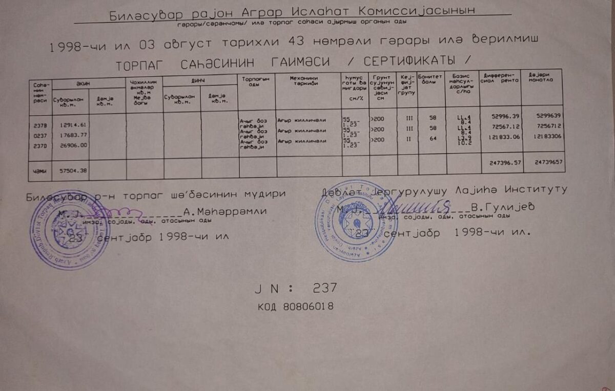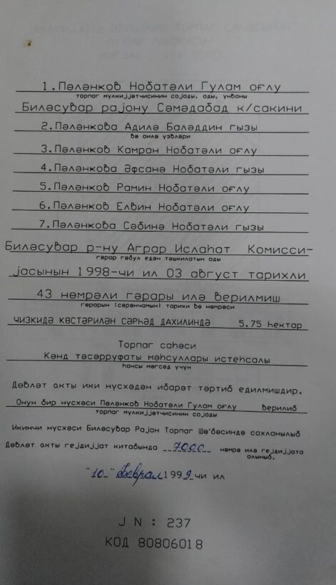 “Çıxarış almaq üçün lazımi sənədlərimi Daşınmaz Əmlakın Dövlət Reyestr Xidmətinin Biləsuvar Rayon Şöbəsinə təqdim etdim. Ərizənin son icra tarixi 2023-cü il mayın 9-u olmasına baxmayaraq, ona heç bir rəsmi cavab verilmədi. Mayın 10-da Daşınmaz Əmlakın Dövlət Kadastrı və Reyestrinin “Qaynar xətti”nə zəng etdim. Bildirdilər ki, ərizəyə baxılmır. Çünki sənədimdə qeydə alınmış 5,75 hektar sahədən 66 sot çatmır”, – Nabatəli Pələngov deyir.