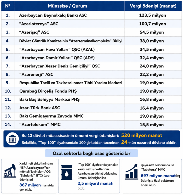 Siyahıda yer alan 100 şirkət ümumilikdə büdcəyə 7 milyard 895 milyon manat vəsait ödəyib. Lakin bu məbləğin böyük hissəsi Azərbaycan Dövlət Neft Şirkəti (SOCAR) və onun tabeliyində olan müəssisələrin hesabına formalaşıb.