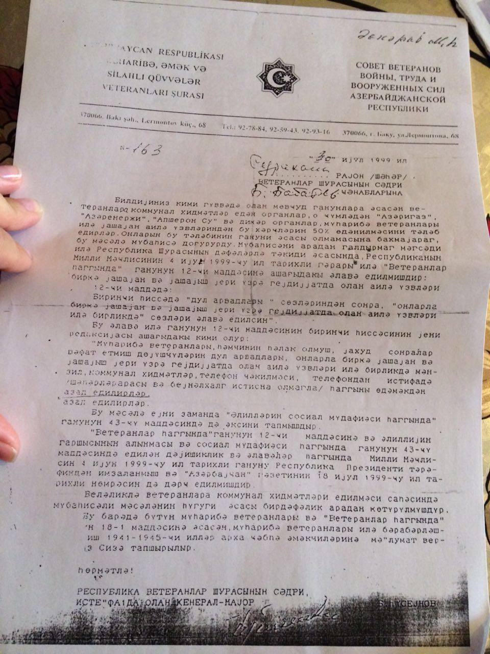 “Tərtərin hərbi hissəsindən kağız da gəlib. Hərbi biletim olduğu halda yazıblar ki, güyə müharibədə olmamışam. “Semaşko”ya da getdik, təsdiqləndi ki, bədənimdə qəlpələr var, amma “Forma 88” deyilən kağızı vermədilər ki, sizə düşmür. Sonradan məlum oldu ki, 100-200 manat vermək lazım imiş. Suraxanı rayonunda yerləşən 23 saylı poliklinikanın cərrahı qanunsuz hərəkətlər edir. Adı Sədi Qurbanovdur. Deyir: “Forma istəyirsinizsə, əliniz cibinizdə olsun”. Neçə yerdə özəl poliklinikası var, iflic olan adamlara belə sənəd vermək üçün nə qədər pul tələb edir. Mənə deyirlər ki, müharibə üçün xərc bahadır, istəyirsən vərəm adına yazaq səni, o, 50 manatdır, pensiyaya o yolla çıx”.