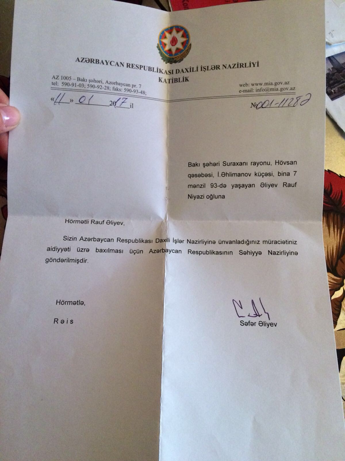 “O adamın dediyi boş sözlərdir. Şikayət edibsə, buyurun, gəlin baş həkimin yanına, Rauf Əliyevin ambulator kitabçasını versin, baxın. Onun xəsarəti yoxdur. Buna baxmayaraq, onu 2 dəfə 1 saylı Tibbi Kliniki Mərkəzə (Semaşko) komissiyaya göndərmişik. Yəqin xəbəriniz var, indi yoxlama kompüter sistemi ilədir. Hər iki yoxlamadan da cavab gəlib ki, ona əlillik dərəcəsi düşmür. İstədiyiniz vaxt gəlib komissiyanın rəyi ilə də tanış ola bilərsiz. Bu, elə bir prosesdir ki, biz ordakı həkimlərin üzünü görmürük. Kompüterə yazırıq, onlar da nə cavab verirlərsə, ona uyğun işləyirik”.