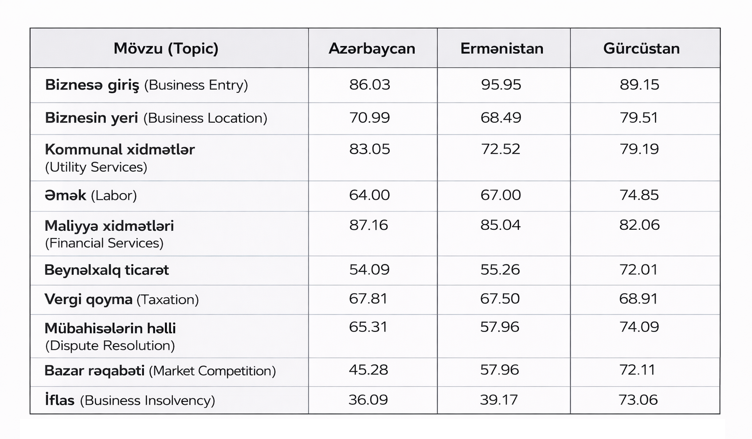 Azərbaycan 10 alt göstərici üzrə ən yüksək nəticəni “kommunal xidmətlər” və “maliyyə xidmətləri” sahələrində əldə edib. Belə ki, ölkəmiz “maliyyə xidmətləri” komponenti üzrə mümkün 100 baldan 87,1 bal, “kommunal xidmətlər” üzrə isə 83,05 bal toplayıb. Ən aşağı göstərici isə müflisləşmə (biznesin iflası) sahəsinə aiddir — 36,09 bal. Bu, ölkədə bizneslərin bazardan çıxış mexanizmlərinin kifayət qədər çevik və şəffaf olmadığını göstərir.