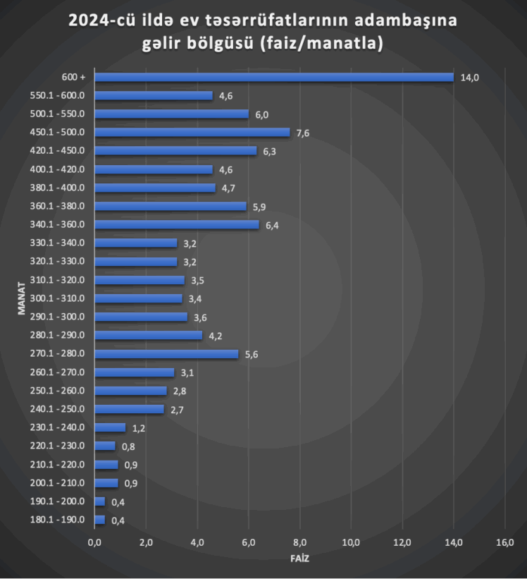 Bundan əlavə, əhalinin 12,3 faizi minimum əməkhaqqı səviyyəsində – 340-380 manat gəlir əldə edib. Lakin bu göstərici “komfortlu həyat” deyil, yalnız “minimum tələbatların ödənilməsi” səviyyəsi kimi qiymətləndirilə bilər.