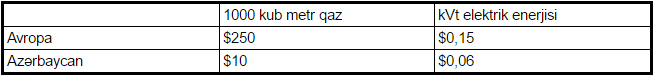 Tariflərin artırılması üçün əsas yoxdur, belə ki, Azərbaycan ucuz enerji resurslarının istehsalçısıdır. Yataqdan istehlakçıya qaz çatdırılması 10 dollara başa gəlir və müvafiq olaraq elektrik enerjisi istehsalının maya dəyərində onun xüsusi çəkisi cüzidir. Avropada və Azərbaycanda elektrik enerjisi və qaz qiymətlərinin müqayisəli təhlili aşağıdakı mənzərəni göstərir: