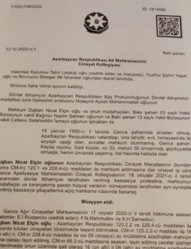 Ali Məhkəmə təqsirləndirilən şəxsə “yox” desə də, zərərçəkmiş tərəfin kassasiya şikayətinə və prokurorluğun protestinə münasibətdə Gəncə Apelyasiya Məhkəməsinin qərarını ləğv edib. İş yenidən araşdırılması üçün bu instansiyaya qaytarılıb.