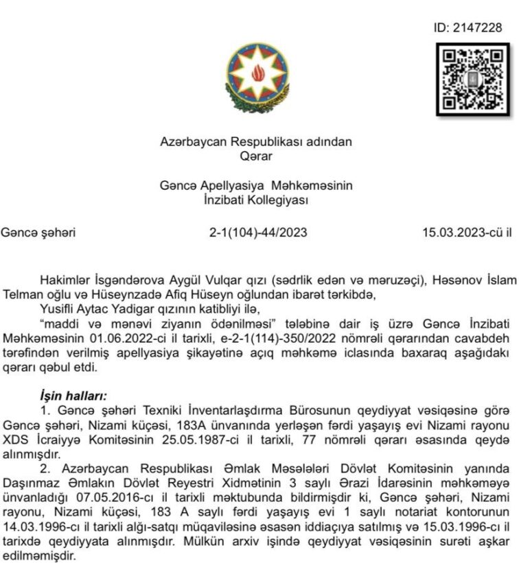 “Gəncə Şəhər İcra Hakimiyyəti bununla bağlı heç bir qərar verməyib, söküntü işləri aparmayıb. Özü də bildirir ki, 2012-ci ilin aprel ayında tanımadığı şəxslər heç bir sənəd təqdim etmədən gəlib, ona və ailə üzvlərinə deyiblər ki, evin sökülməsinə razılıq versinlər. Həmin şəxsləri tanımadığını özü bildirdiyi halda, məhkəmə əsas olmadan bu addımın Gəncə Şəhər İcra Hakimiyyətinin nümayəndəsi tərəfindən həyata keçirildiyi qənaətinə gəlib. Kompensasiyanın icra hakimiyyətindən tələb edilməsi qanunauyğun hesab edilə bilməz. Bununla bağlı mötəbər sübut yoxdur”.
