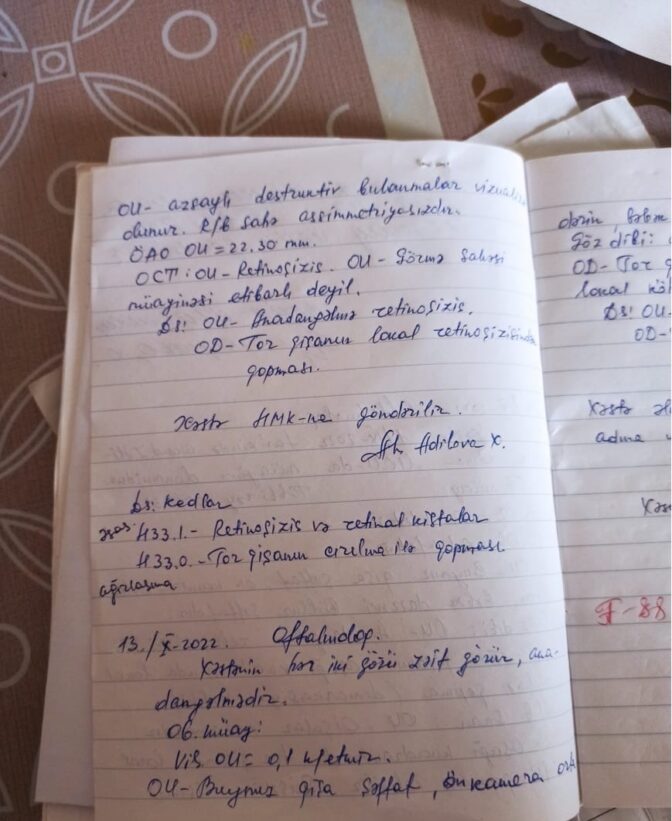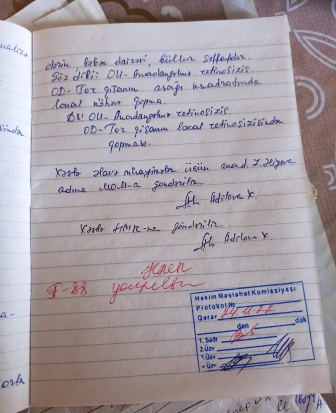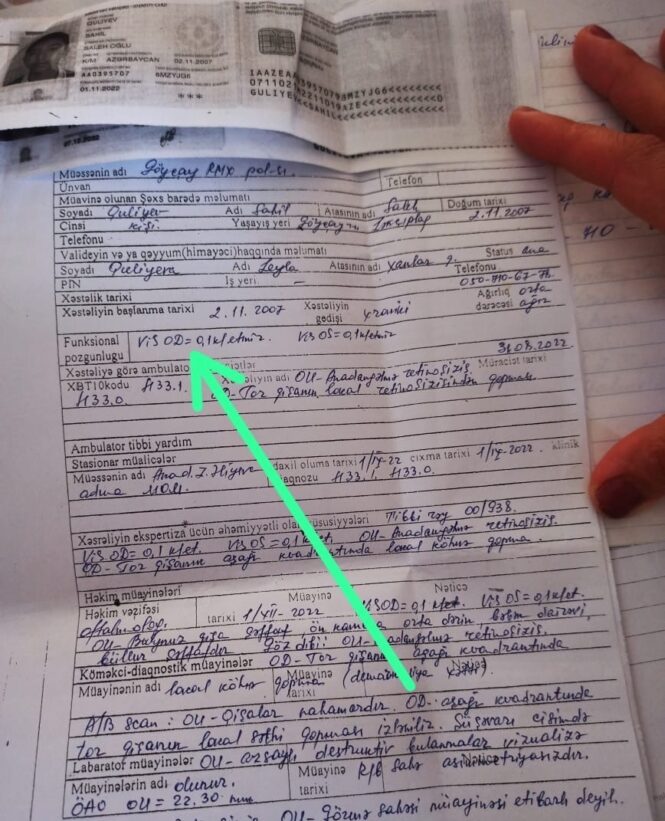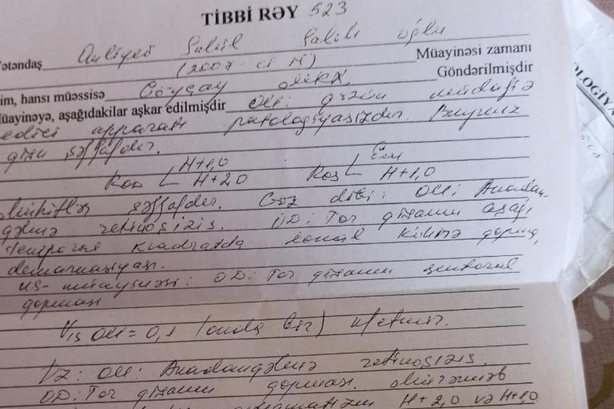 “Dedilər, əməliyyat yaxşı nəticələnməz. 100-ə 99 faiz belə qarantiya yoxdur. Deyirlər ki, getdikcə, böyüdükcə gözdə görmə daha da zəifləyəcək. 18 yaşdan sonra isə əllilik dərəcəsi verəcəyik. Amma bizi sentyabrdan get-gələ salıblar. Burada bütün yoxlanışdan keçib, kağızların yığıb Bakıya – Zərifə Əliyeva adına Milli Oftalmologiya Mərkəzinə getdik. Orada yoxlayıb: “Kodu düzgün deyil, yazılmayıb”, – deyə yenidən rayona göndərirlər. Bu dəfə də rayonda yoxladılar ki, Bakı düzgün qeyd etməyib, biz lazım olan hər şeyi kağızlarında qeyd etmişik”.
