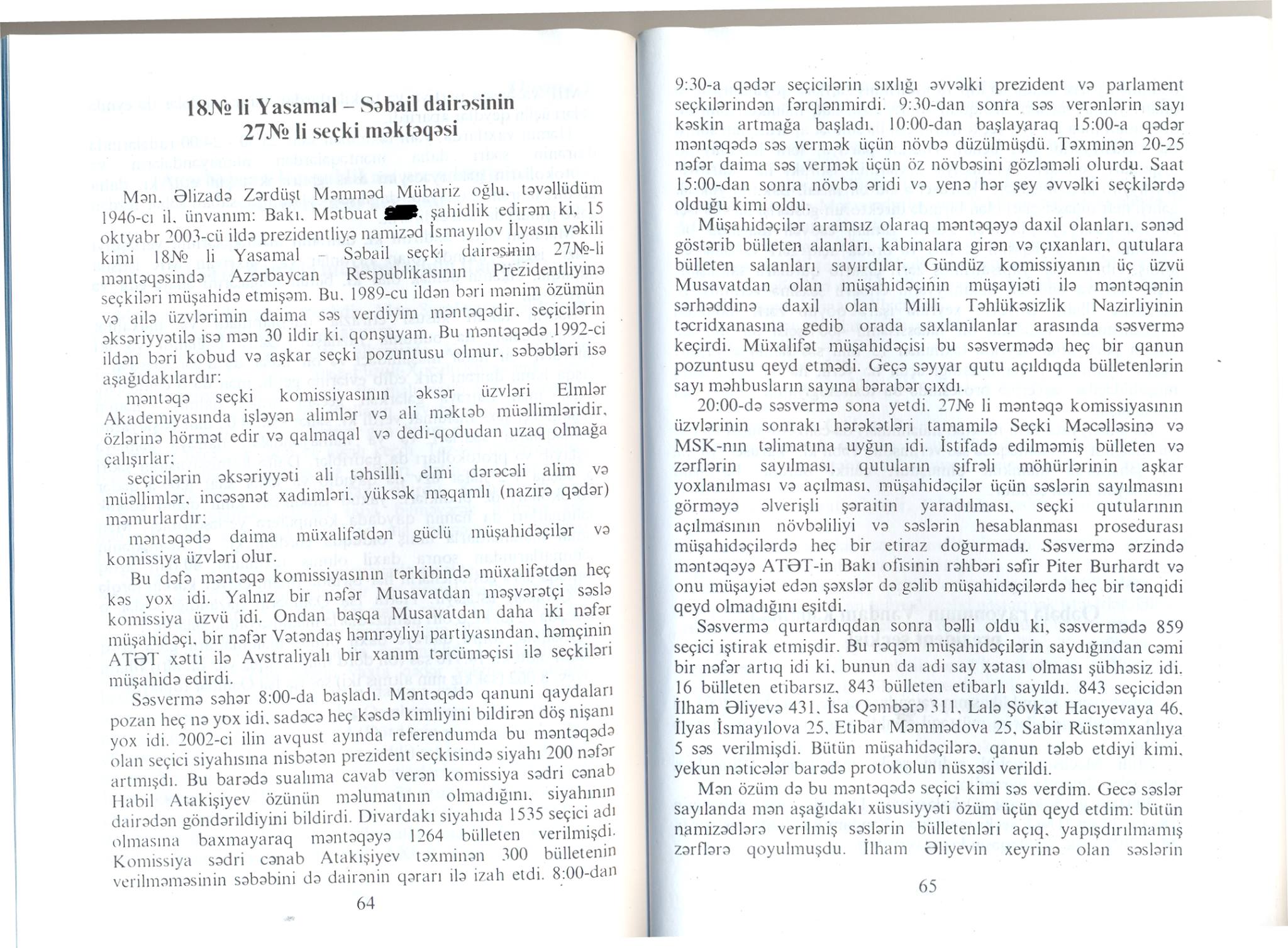 “Mən, Əlizadə Zərdüşt Məmməd Mübariz oğlu, təvəllüdüm 1946-cı il, ünvanım: xxx, şahidlik edirəm ki (!), 15 oktyabr 2003-cü ildə prezidentliyə namizəd İsmayılov İlyasın vəkili kimi 18 N-li Yasamal-Səbail seçki dairəsinin 27 N-li məntəqəsində Azərbaycan Respublikasının Prezidentliyinə seçkiləri müşahidə etmişəm”.