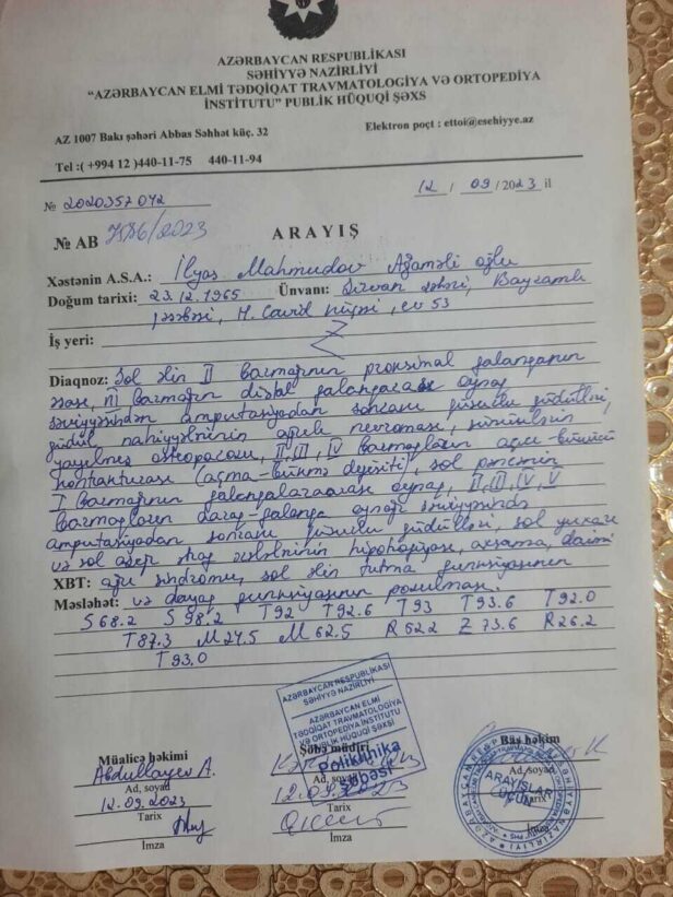 Şirvan şəhər sakini İlyas Mahmudov bu il, aprelin 7-də işdə xəsarət alıb. Onun sol əlinin iki və üçüncü barmaqları 1-ci buğundan, eləcə də sol ayağının bütün barmaqları ambutasiya olunub.