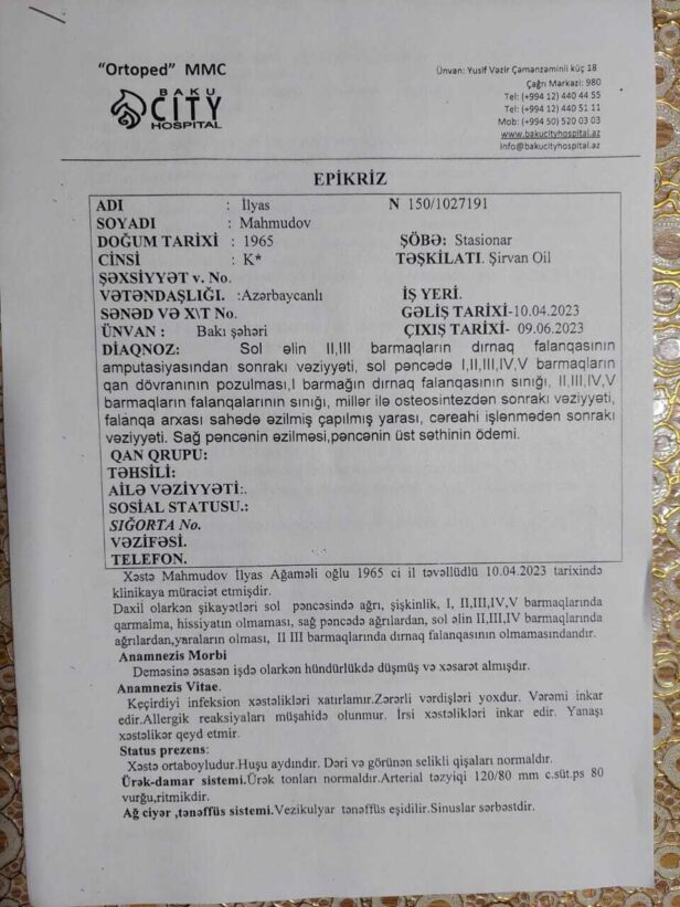 “Mənimlə bağlanan əmək müqaviləsinin müddəti gələn ay bitir. Doğrusu, şirkət işdən çıxarmaqla bağlı heç nə deməyib. Lakin müvafiq komissiyadan keçmək üçün Bakıya göndərdilər. Müayinə edən həkimlər dedilər ki, xəsarətlər çoxdur, əli hərəkət etdirmək çətindir. Hələlik əlillik verilib-verilməyəcəyini də bilmirəm”.