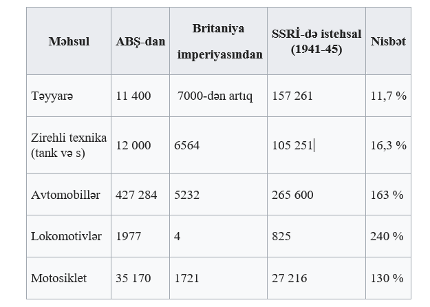 Aşağıdakı cədvəldə SSRİ-yə göndərilən hərbi texnikanın miqdarı və onun SSRİ-dəki istehsala nisbəti göstərilir.