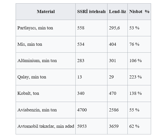 Növbəti cədvəldə isə lend-liz üzrə göndərilən bəzi materiallar və ərzaq məhsullarının yerli istehsalla nisbəti təqdim olunur.