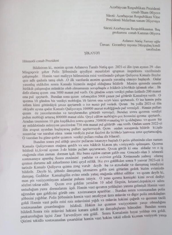 “Samuxa, Gəncəyə gələndə görüşmək üçün neçə dəfə teleqram vurdum, imkan vermədilər. Axırıncı dəfə təxminən 10 gün əvvəl prokurorluqda olmuşam. Orada araşdırmaları Tural müəllim aparır. O da deyir ki, narahat olma, araşdırma gedir. Guya Mingəçevir prokurorluğundan Zaur Tarverdiyevi çıxarıb, sərəncama göndəriblər. Bilmirəm ki, nə dərəcədə doğrudur. Lap doğru olsa da, bir müddət sonra başqa yerə işə göndərərlər. Kəmaləni də deyirlər, işdən çıxarıblar. Hə, nə olsun?! Bəs kim cəzalanıb? Mingəçevirin prokurorunun da baş verən hər şeydən xəbəri olub. Ona görə qızım əvvəl Baş prokurora, prezidentə məktub yazmışdı, amma baxan olmadı. Ürəyim partlayır, kasıb olanda adamın başına hər oyunu gətirərlər?”, – Natiq Aslanov əlavə edib.