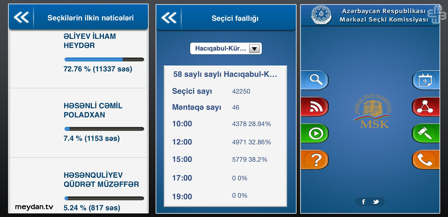 Mərkəzi Seçki Komissiyası seçkilərlə əlaqədar IOS və Android telefonlar üçün tətbiqetmələr düzəldib. Bu gün tətbiqetmələri mobil telefonuna yükləyən istifadəçilər sabah olacaq seçkilərin nəticələri ilə qarşılaşıblar. Belə ki, səsvermədə İlham Əliyevin 72.76%, Cəmil Həsənlinin 7.4%, Qüdrət Həsənquliyevin 5.24% olduğu görünür. Hətta seçici fəallığı, seçki məntəqəsinin adı, saatlara görə nə qədər seçicinin səs verdiyi də qeyd olunub. Hazırda isə həmin bölmə telefonlarda bağlıdır və daxil olarkən “Bu bölmə seçki günü aktiv olacaq” yazılıb. Böyük ehtimalla tətbiqetməni hazırlayanlar həmin bölməni “bağlı” etməyi unudublar.