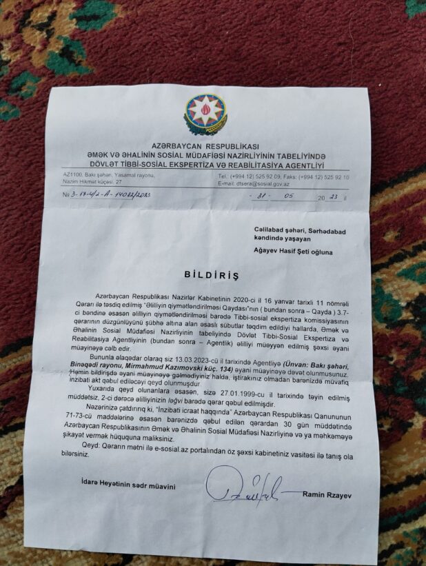 “Xəstəliyimin getdikcə ağırlaşması nəticəsində şəffaf şəkildə keçirilən tibbi müayinə nəticəsində 1999-cu ilin yanvarından etibarən mənə müddətsiz II qrup əlillik dərəcəsi təyin olundu. Ötən ilin martına qədər əlillik müavinətini alırdım. 13 mart 2023-cü ildə Əmək və Əhalinin Sosial Müdafiəsi Nazirliyinin tabeliyində Dövlət Tibbi-Sosial Ekspertiza və Reabilitasiya Agentliyi məni əyani müayinəyə dəvət etdi. Üzrlü səbəbdən əyani müayinəyə gedə bilmədim. Bunu əsas gətirərək dərhal aidiyyəti inzibati akt tərtib olunaraq əlillik dərəcəm ləğv edilib”,- deyə Hasif Ağayev qeyd edib.