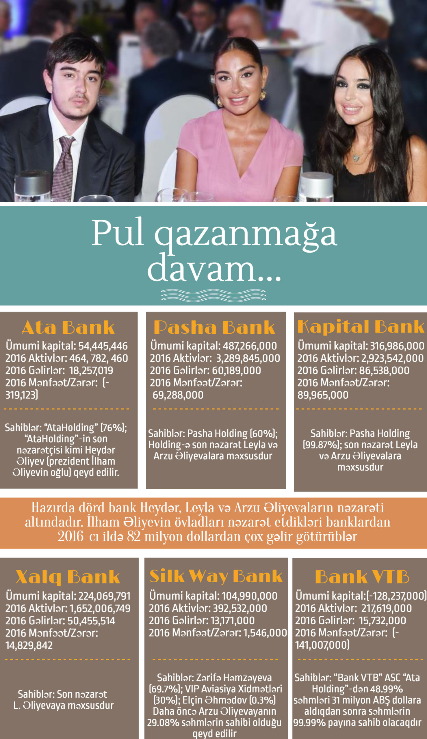 2016-cı il Azərbaycan bankları üçün borclanma, müflis olma, bağlanma ilə yadda qaldı. Yalnız bu proseslər bəzi banklardan yan keçdi. Bunlar prezident İlham Əliyevin övladlarının nəzarət etdiyi banklardır. Əliyevlər 2016-cı ildə bu banklardan 82 milyon ABŞ dollarından çox gəlir götürüblər. Ümumilikdə isə Azərbaycanın bank sektoru ötən il 960 milyon dollar itirib.