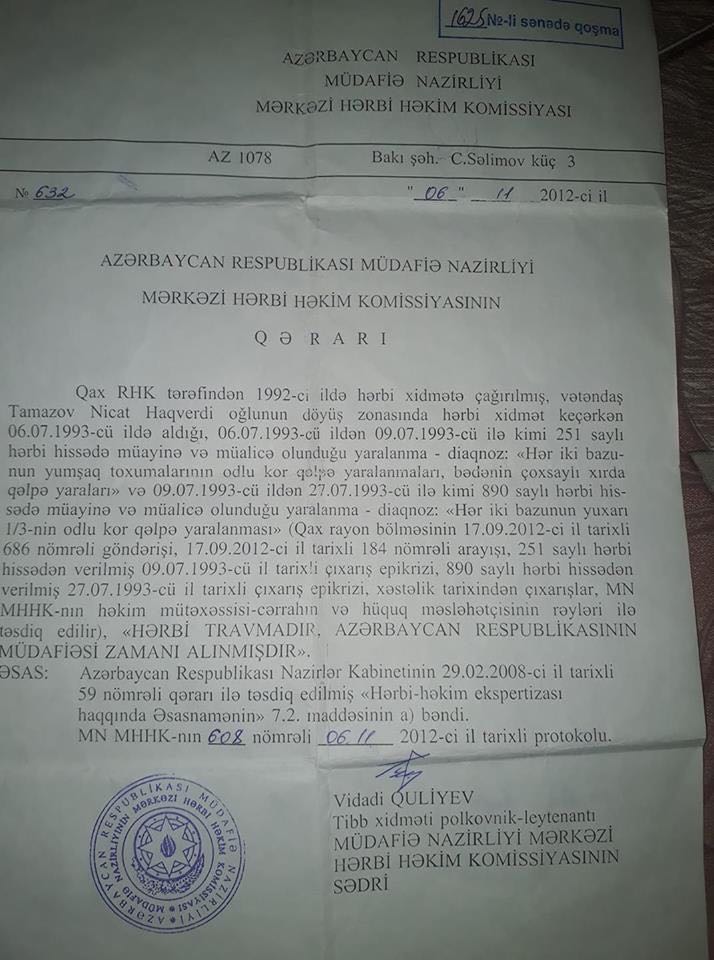 “Qrad mərmisi məndən təxminən 5-10 metr kənara düşdü, partladı. Qəlpələr qoluma, başıma, bədənimə doldu. Hər iki bazunun yumşaq toxumaları, bədənin çoxsaylı qəlpə yaralanması ilə müalicə olunmuşam. Kontuziyam var, aldığım xəsarət nəticəsində orqanizmim ümumi olaraq zəifləyib. Heç bir fiziki işlə məşğul ola bilmirəm. Qəlpələri də bədənimdən çıxarmaq olmaz, həkimlər deyir ki, ölüm təhlükəsi yarana bilər. İstəyim odur ki, canımı vətən yolunda qoyduğum dövlətim mənə əlillik dərəcəsi versin, ailəmi dolandır bilim”, – Nicat Tahmazov belə deyir.