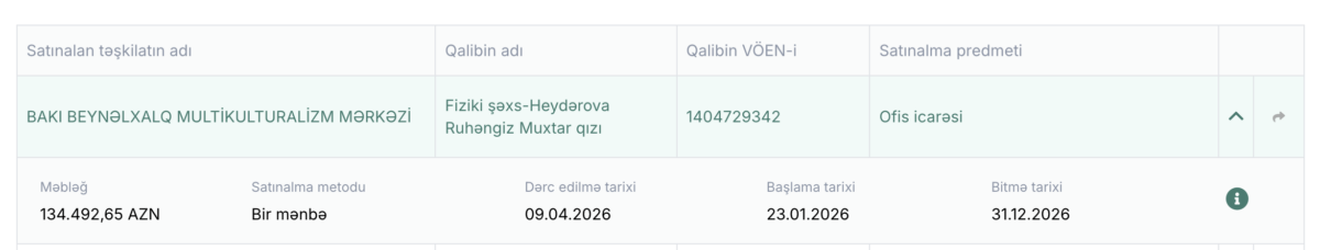 Sənədə görə, Mərkəz 23 yanvar 2026-cı ildən 31 dekabr 2026-cı ilədək Heydərova Ruhəngiz Muxtar qızına məxsus qeyri-yaşayış sahəsini icarəyə götürüb. İcarə haqqı kimi isə ümumilikdə 134 min 492 manat 65 qəpik ödəniləcək.