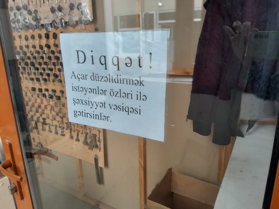 O həm də çox diqqətcil və məsuliyyətlidir. İş yerinin qapısına vurduğu elan da bunu göstərir. Açar sifariş edənlərdən təhlükəsizlik üçün şəxsiyyət vəsiqəsi tələb edir.