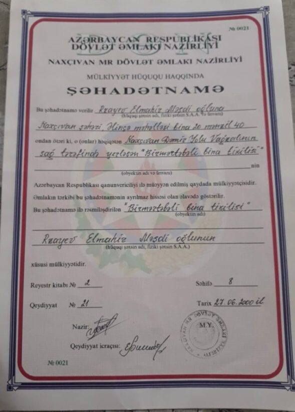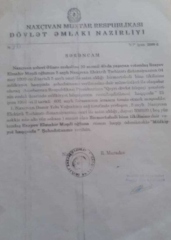 Əmlak sahibinin sözlərinə görə, 1999-cu ildə alıb, 2002-ci ildə özəlləşdirdiyi bu obyekt Azər Zeynalov “Naxçıvan Dəmir Yolları”na rəis təyin olunandan az sonra sökülüb.