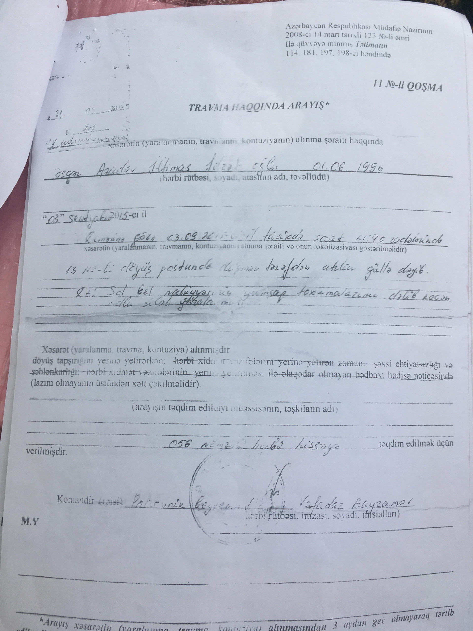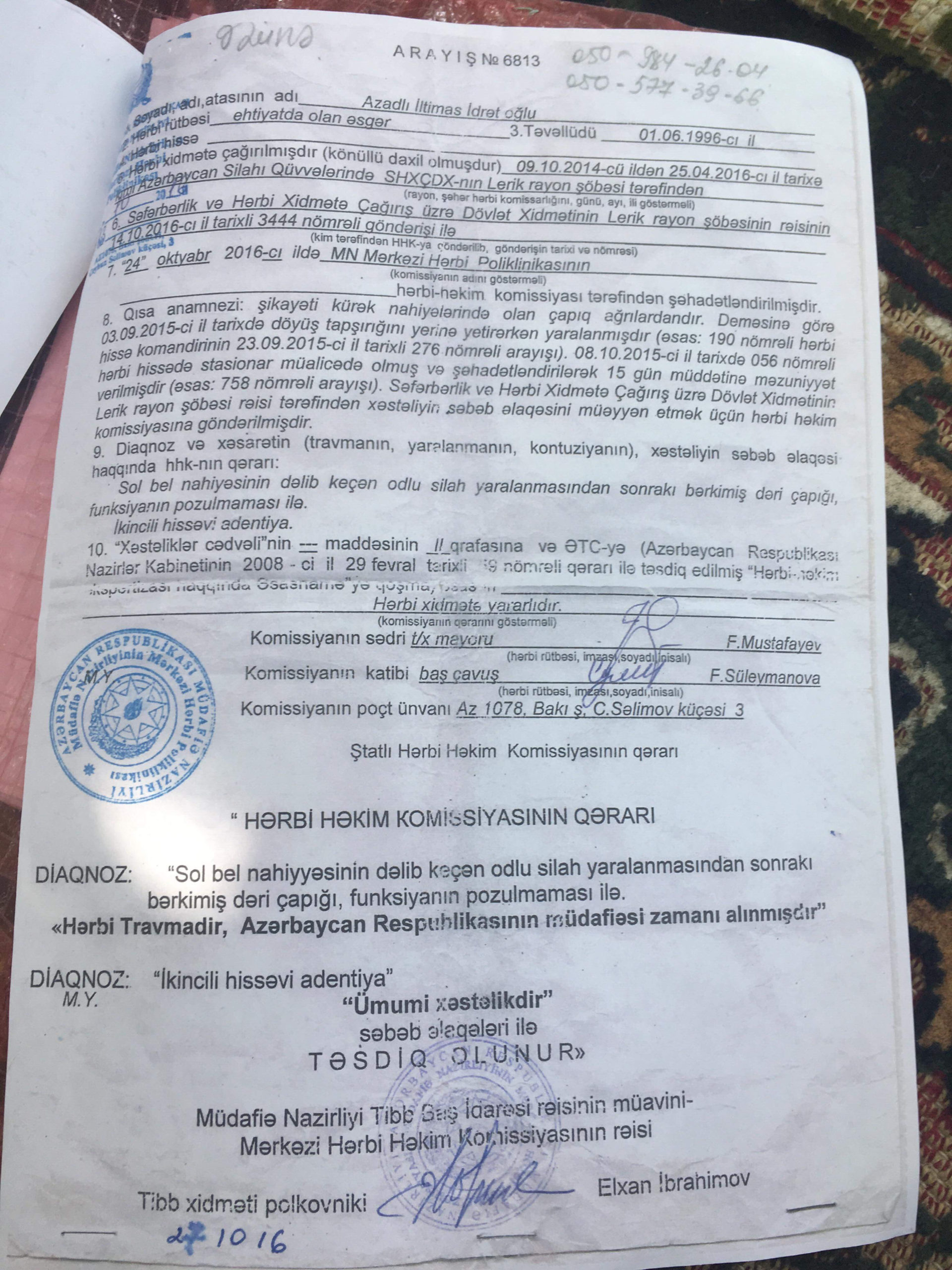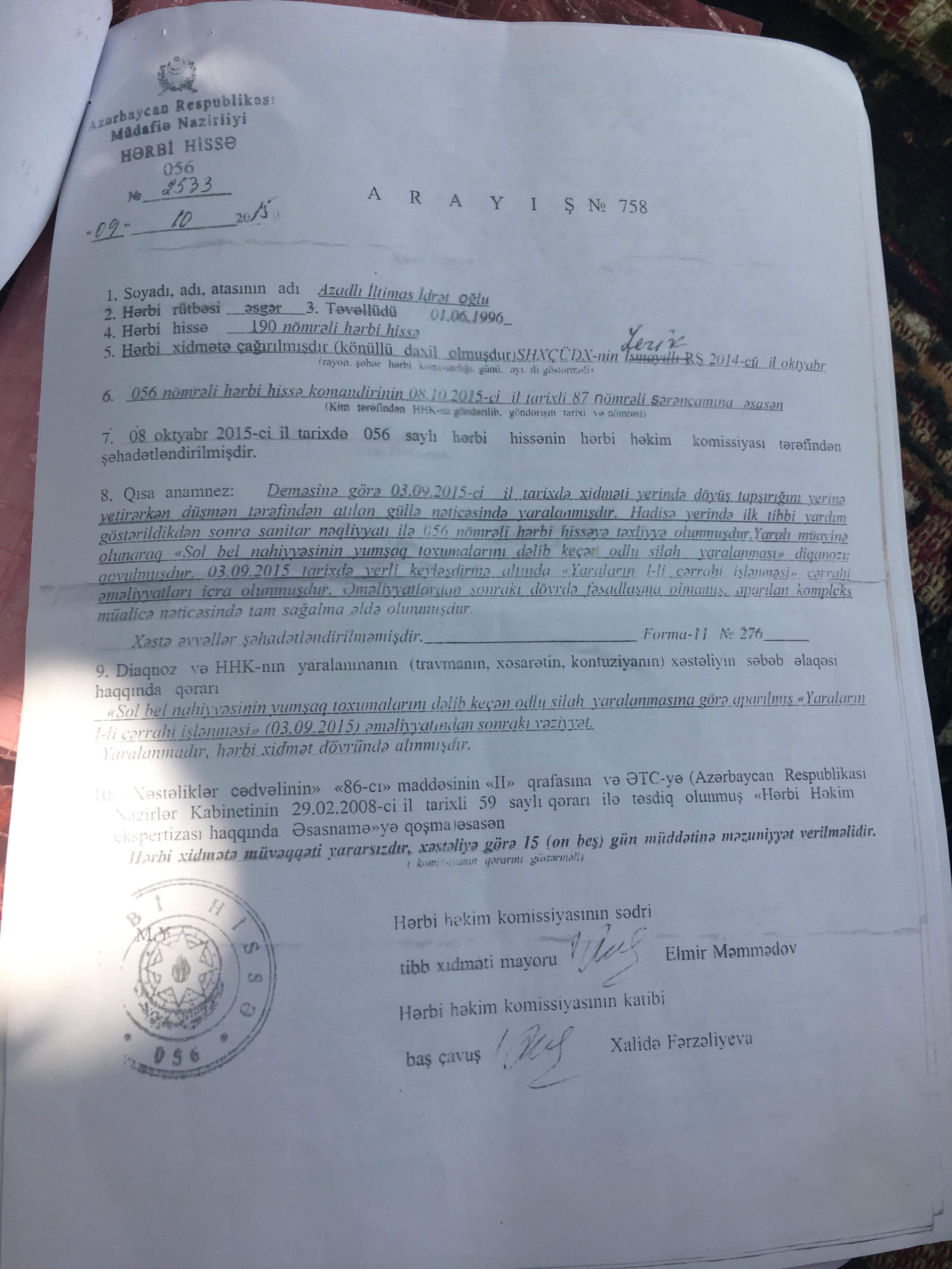 İdrət Azadov deyir ki, Hərbi Həkim Komissiyasının qərarı ilə oğluna ağır travma diaqnozu qoyulub. Qərarda belə yazılıb: ““Sol bel nahiyyəsinin dəlib keçən odlu silah yaralanmasından sonrakı bərkimiş dəri çapığı ilə “Hərbi travmadır, Azərbaycan Respublikasının müdafiəsi zamanı alınmışdır”.