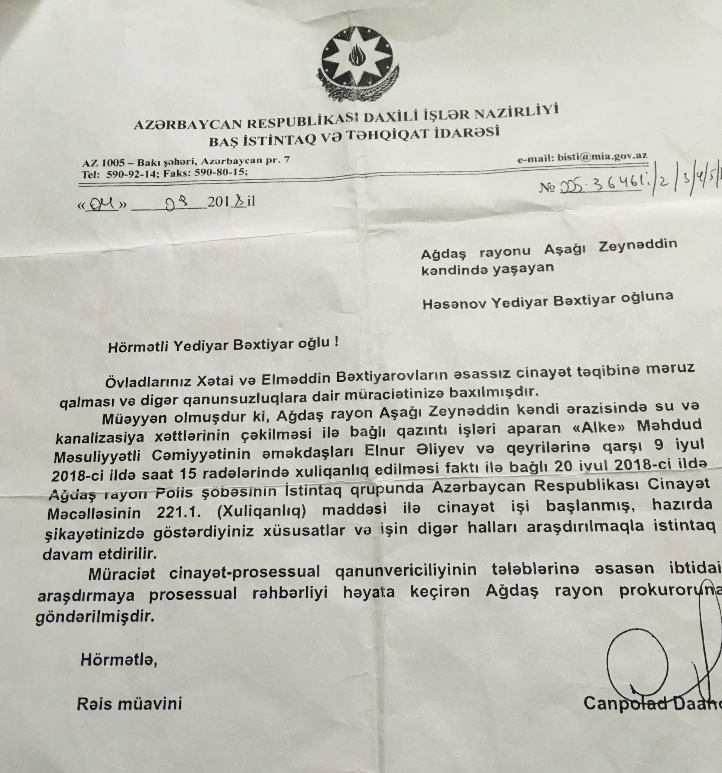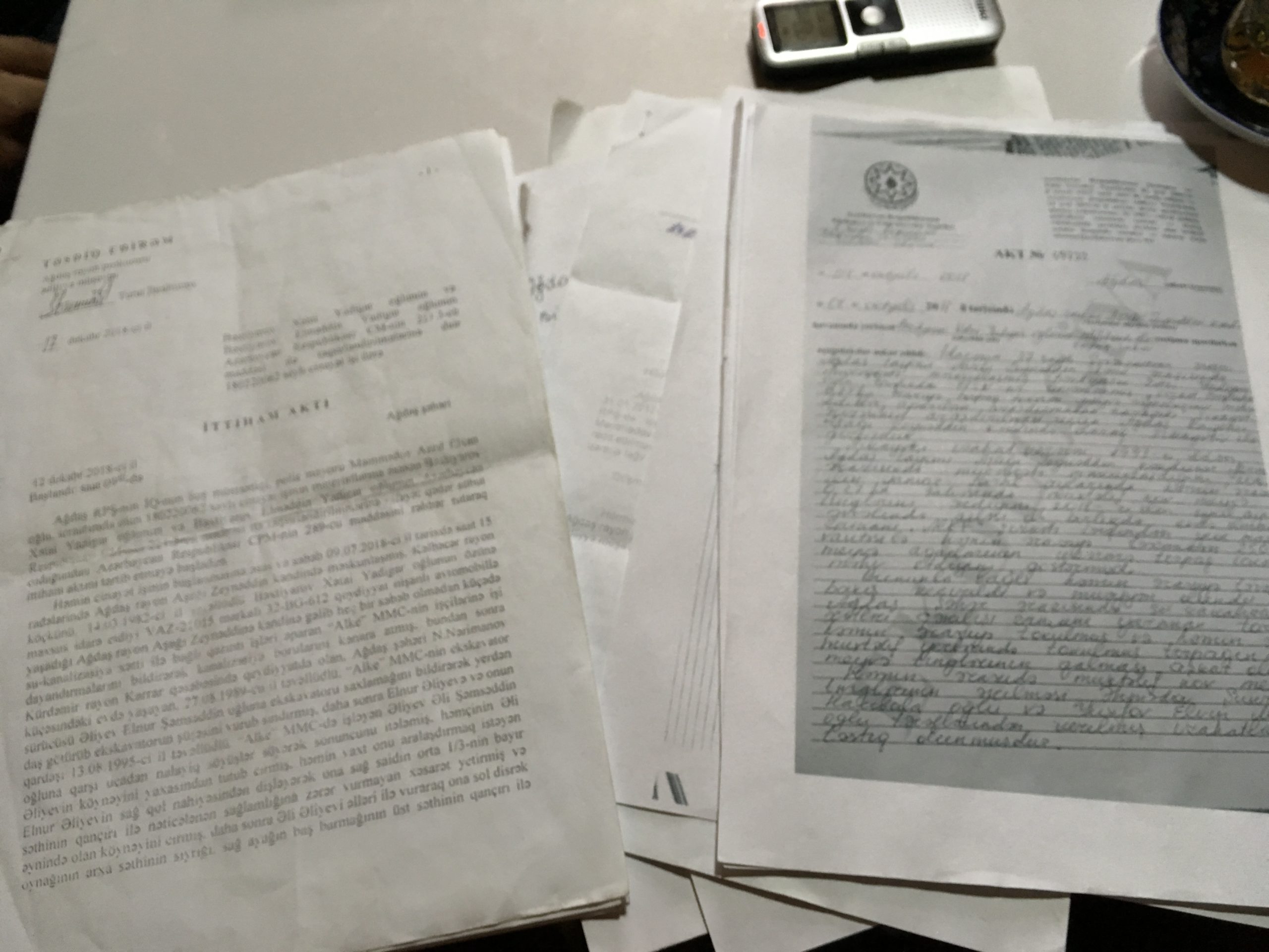“Bir müddət əvvəl yaşadığımız kənddə su-kanalizasiya sistemi çəkirdilər. Ancaq qanunda, layihədə həmin kanalizasiya, su xətti biz tərəfdən keçmirdi. Buna baxmayaraq, biz evdə olmayanda gəlib bizim meyvə verən 250 ağacı məhv ediblər. Ərazidə apardıqları bütün qazıntı işlərinin torpaqlarını bizim ağacların üstünə töküblər. Biz şikayət üçün polisə zəng etdik. Polis gəlib onlara yox, qardaşlarıma qarşı cinayət işi açdı. Guya onlar bu dəfə isə əllərində balta ilə dövlət layihəsinə qarşı çıxıb, onların işinə maneçilik törədiblər. Sözün düzü, həmin gün Elməddin heç orada olmayıb. Yazmadığımız yer, şikayət etmədiyimiz adam qalmayıb. Xeyri yoxdur”.