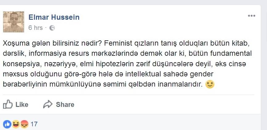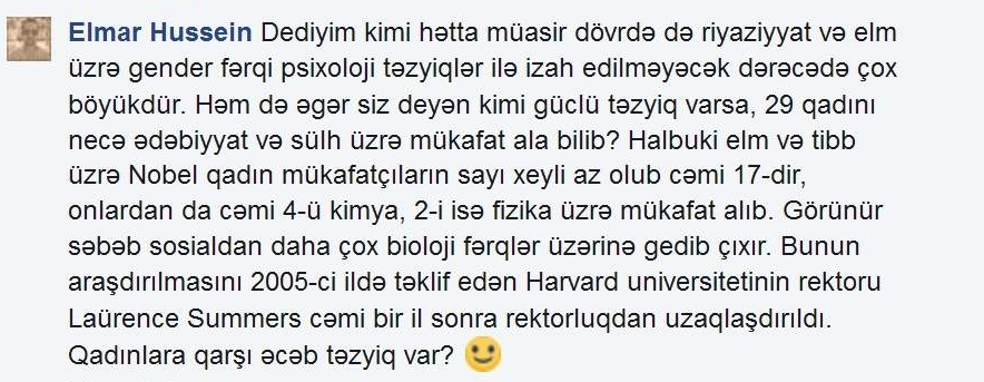 Lakin Bakı Dövlət Universitetinin fəlsəfə və məntiq müəllimi  Elmar Hüseynov, qadınların ağlını şübhə altına qoyur. Tələbələrin etiraz cümlələrinə arqument tapmayanda isə “Facebook”-da status yazır. Bu, bilirsiz nəyə bənzəyir? Qaradərili tələbələrin olduğu auditoriyaya girib, “sizin oxuduğunuz bütün nəzəriyyələr ağdərililər tərəfindən yazılıb, onun üçün də qaradərililər heç vaxt ağdərililər qədər intellektə sahib deyillər” deməyə. Belə deyəni anında irqçi adlandırırlar, biz isə qadınlar barədə bu cəfəngiyyatı danışana “müəllim” demək məcburiyyətindəyik.