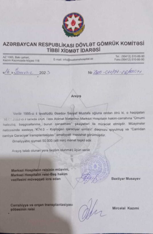 Mərkəzi Gömrük Hospitalında mənə qaraciyəri köçürülməsi məsləhət görülüb. Əməliyyatın qiyməti əlli min manatdır. Donor anamdır, lakin bizim bu qədər pulumuz yoxdur. Valideynlərim işləmir. Atam Mustafa Əsədov Birinci Qarabağ döyüşlərində ayağından bir neçə qəlpə yarası almışdı. Ona əllilik verilmədiyi üçün veteranlıqdan da imtina etmişdi. Hazırda axsaya-axsaya yeriyir. Üç nəfərdən ibarət ailə mənə veriən 80 manat veteran pulu ilə dolanır. Prezident İlham Əliyevdən mənə yardım edilməsini xahiş edirəm”, – Səyyaf Əsədov deyir.