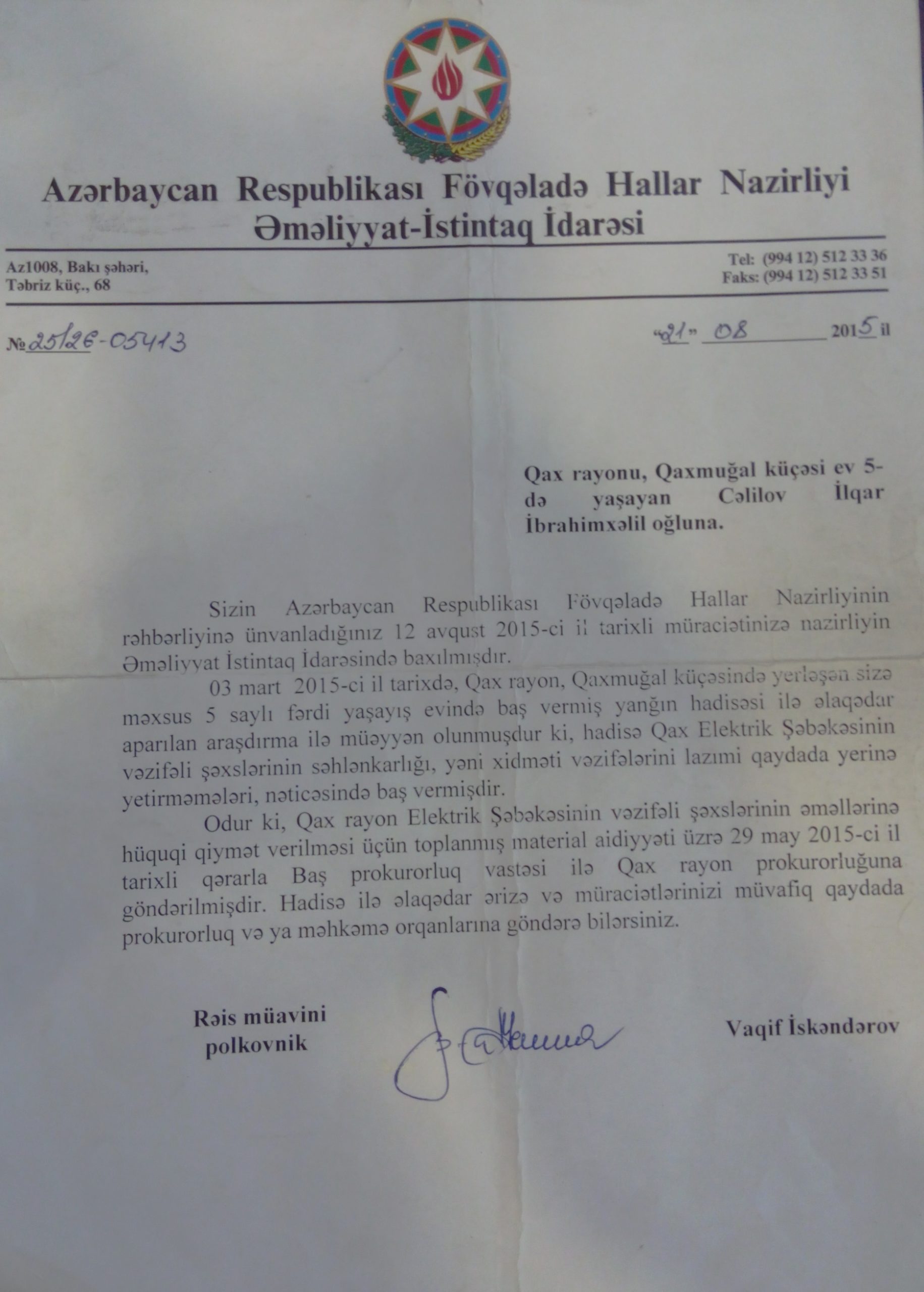 “Evim 2015-ci ilin martında alışıb yandı, kül oldu. Həyətimdən evimin külünü 16 “Kamaz”a doldurub apardılar. Müraciətim əsasında Fövqəladə Hallar Nazirliyindən yoxlama gəldi. Rəy verdi ki, yanğın elektrik xətlərində gərginliyin dəfələrlə artması səbəbindən yaranıb. O gündən bugünə qədər başıma gətirilməyən müsibət qalmayıb. “Azərişıq” ASC Şimal-Qərb Enerji Təchizatı Regional İdarəsinin rəisi İlham Hüseynov evimi tikib qaytarmaq əvəzinə məni məhkəmə zalında, hakimin gözləri qarşısında ölümlə hədələyib”.