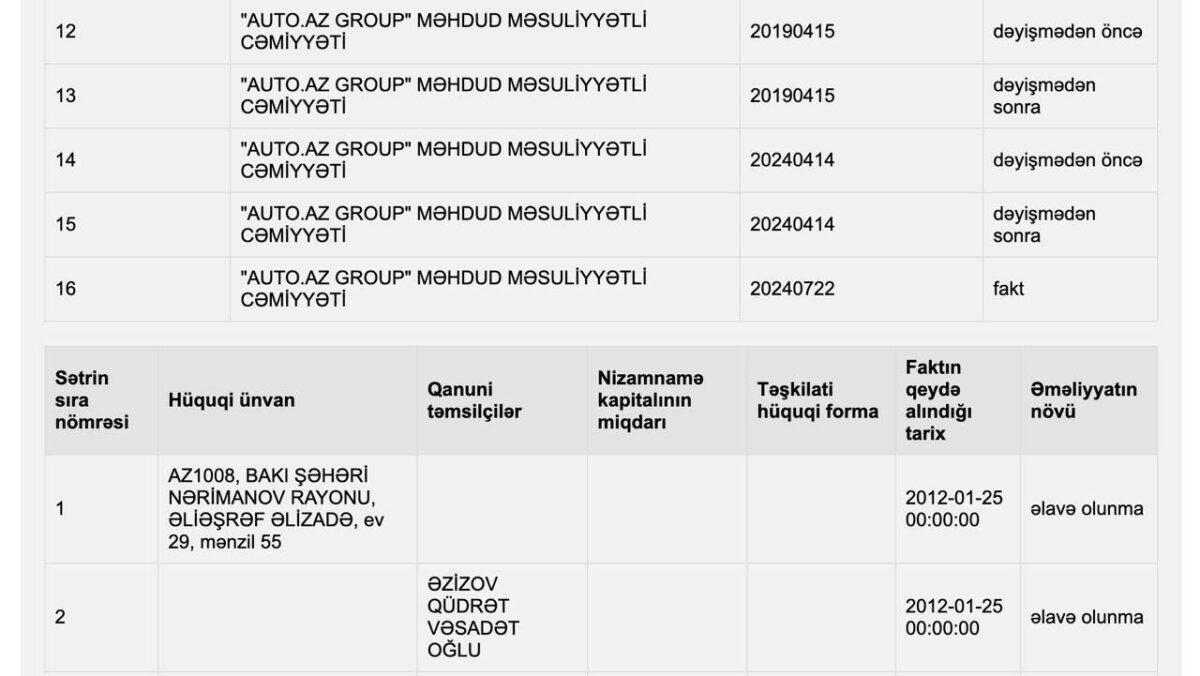 Şirkətin bazadakı detallı məlumatlarında da onun adı qanuni təmsilçi kimi qeyd olunub.