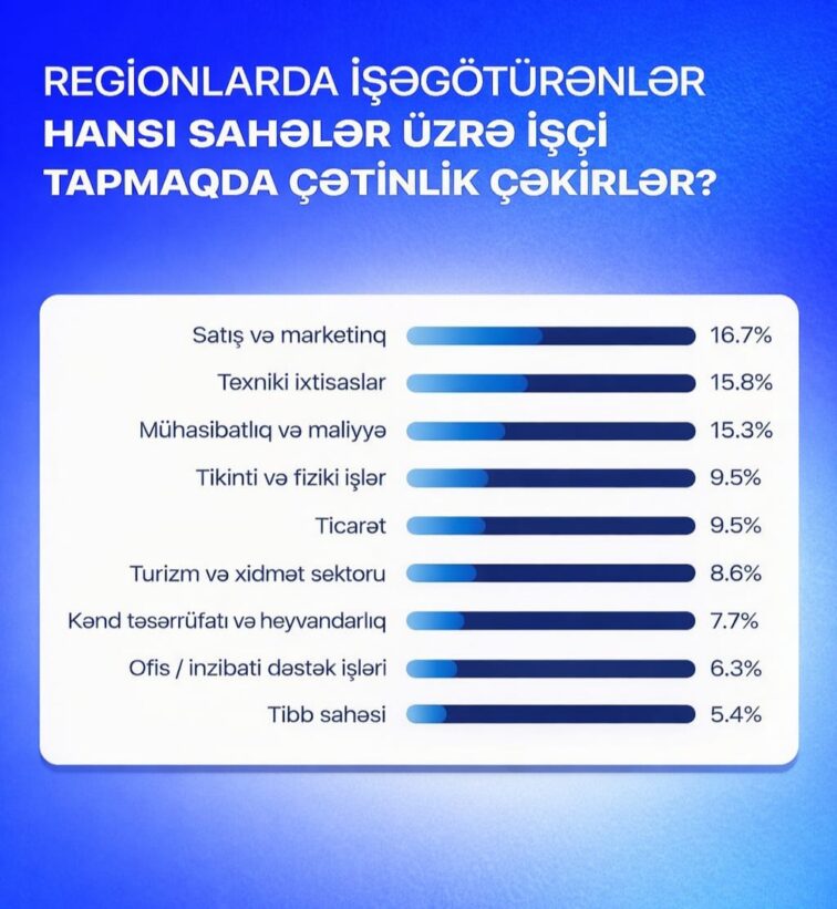 DMA-nın “Əmək bazarı” bülleteninin 5-ci sayı məhz regionlar üzrə ixtisas uyğunsuzluğu və kadr çatışmazlığının ətraflı təhlilinə həsr olunub. Sorğu əsasında aparılan araşdırma göstərir ki, son bir il ərzində regionlarda ən çox vakansiya elan edilən sahələr əsasən texniki peşələr olub. Bu kateqoriyaya elektrik, mexanik, usta və digər oxşar ixtisaslar daxildir. Müəssisələrin 21,2 faizi bu istiqamətdə vakansiya elan etdiyi qeyd edilib. Satış və marketinq sahəsi üzrə vakansiyalar isə 17,1 faiz təşkil edib.