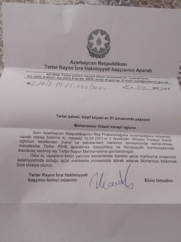 İcra başçısının birinci müavini Elvin Umudov şikayətçi tərəf olan uşağın ana babası Vidadi Məhərrəmova göndərdiyi məktubda yazıb ki, Hüseynin tərəflərdən hansının himayəsində saxlanması məsələsinə Qəyyumluq və Himayəçilik Komissiyasında baxılaraq rəy verilib və həmin rəy də məhkəməyə göndərilib: