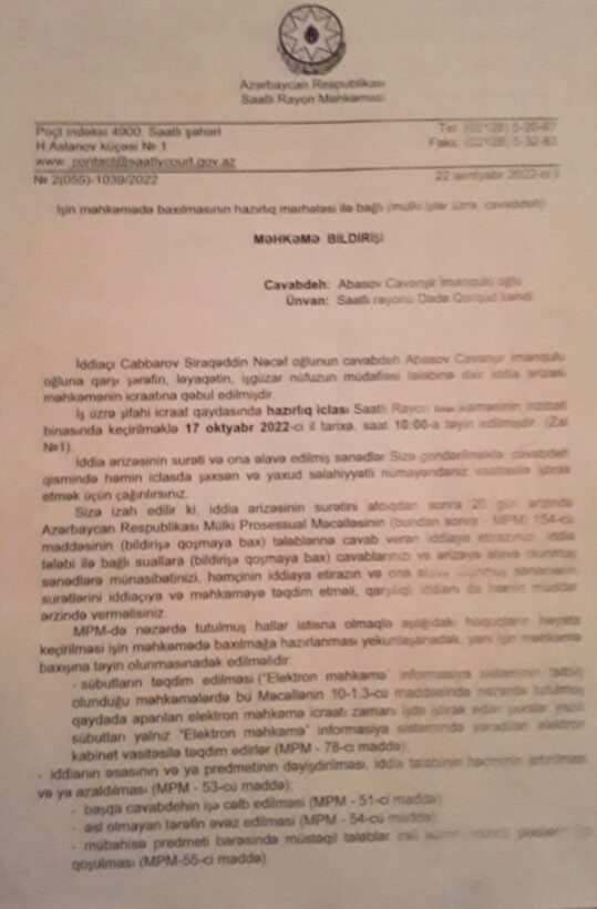 Siraqəddin Cabbarov isə onun dediklərinin böhtan olduğunu bildirərək, buna görə Cavanşir Abbasovu məhkəməyə verib. Əlildən 30 min manat təzminat tələb edən icra başçısının iddiasına Saatlı Rayon Məhkəməsində baxılır.