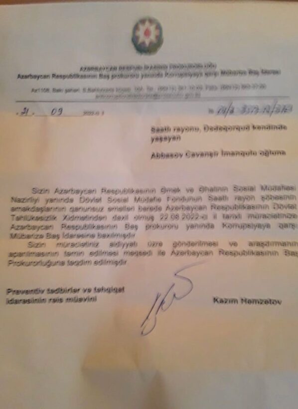 Cavanşir Abbasovun Dövlət Sosial Müdafiə Fondunun Saatlı rayon şöbəsinin əməkdaşlarıyla bağlı (ona çatası vəsaitlərin mənimsənilməsi barədə) şikayətinə Baş Prokurorluğun Preventiv tədbirlər və təhqiqat idarəsinin rəis müavini Kazım Həmzətov cavab verib. O bildirib ki, Cavanşir Abbasovun göndərdiyi şikayətə Korrupsiyaya Qarşı Mübarizə İdarəsində baxılıb: