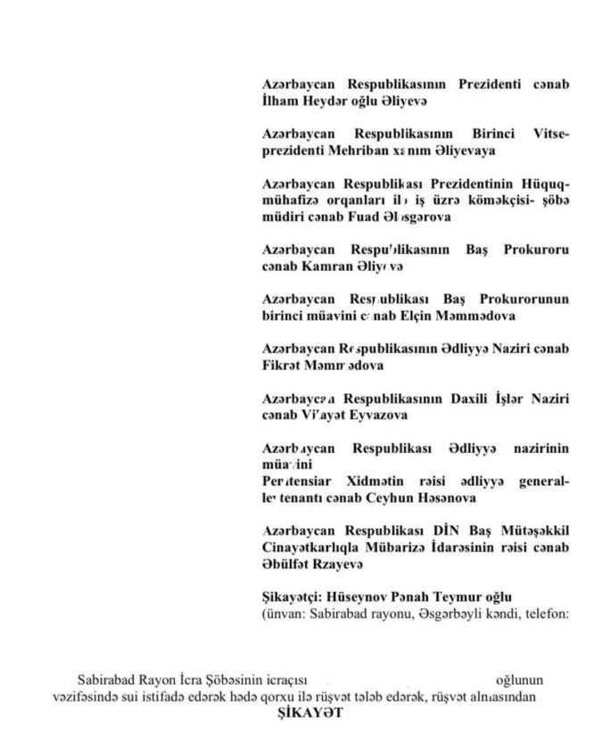 Sabirabad rayonunun Əsgərbəyli kəndində yaşayan Pənah Teymur oğlu Hüseynov icra məmurunun hərəkətindən, Baş Prokurorluğun isə bu barədə şikayəti araşdırmamasından narazıdır. Söhbət Sabirabad rayon İcra Şöbəsinin icraçısına qarşı rüşvət iddialarıyla bağlı şikayətdən gedir.