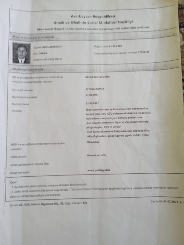 23 yaşlı Cabar Abdurrəhimov anadangəlmə ürək xəstəliyindən əziyyət çəkir. Şamaxı rayonunun Dağ Bağırlı kəndində yaşayan gəncin həyatını əməliyyatla xilas etmək mümkündür. Atası Fayiq Abdurrahimov belə deyir.