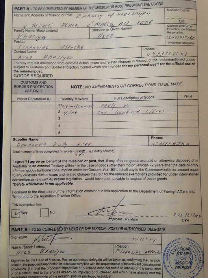 “Avstraliyada fəaliyyət göstərən diplomatik nümayəndəliklərin nə qədər vergisiz məhsul almaq üçün müraciət edə biləcəkləri rəsmi şəkildə qeyd olunub və bizim də müraciətlərimiz bu limit çərçivəsində olur. Avstraliya qəzetinin çap etdiyi məqalədə işlədilən cümlədə müraciətlərin qanunlar çərçivəsində olduğu və qəzetin haqqımızda heç bir ittihamının olmadığı bildirilir. Qeyd etmək yerinə düşər ki, məqalədə sözü gedən müraciət ilə əsl alınmış mallar arasında 80%-lik fərq var. Kanberradakı bütün səfirliklər eyni formada və eyni sayda məhsullar üçün müraciət edirlər və bu müraciət 6 ay qüvvədə olur. Lakin edilmiş müraciətlərin heç 1/5 (beşdə biri) alınmır”.