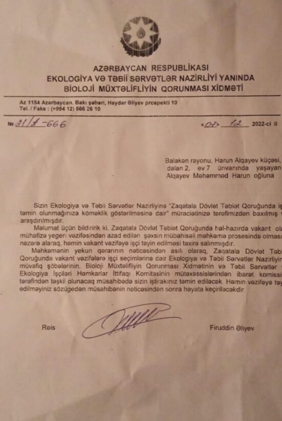 “Beş dəfə məktub yazmışam, hətta dostum mənə görə Namiq müəllimdən xahiş etdi, o da götürmədi. Vəzifəyə yeni gələn Akif müəllim də işə götürmür. Hətta Zaqatala Dövlət Təbiət Qoruğunda vakant yer vardı, hətta bu məsələ məhkəmədə də mübahisələndirilirdi. Mən də ərizə ilə rəsmi müraciət etdim. Dedilər ki, o yer ixtisar edilib və ərazini də öz aralarında bölüşdürüblər. Mənə “yox” deyirlər, yaxın dostum isə dedi ki, vakansiya vardı, yerinə yenə başqasını götürdülər”.