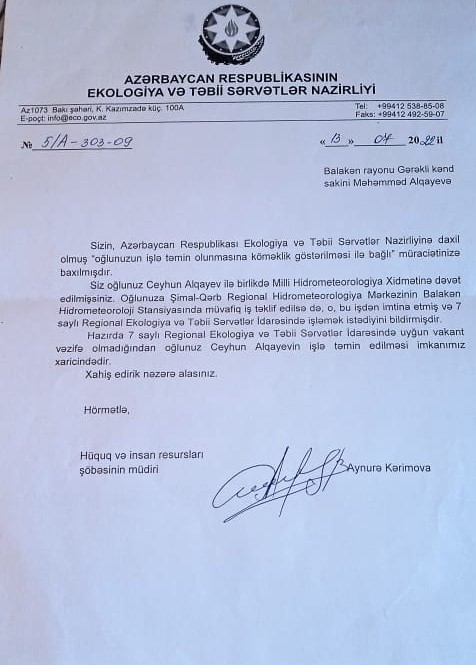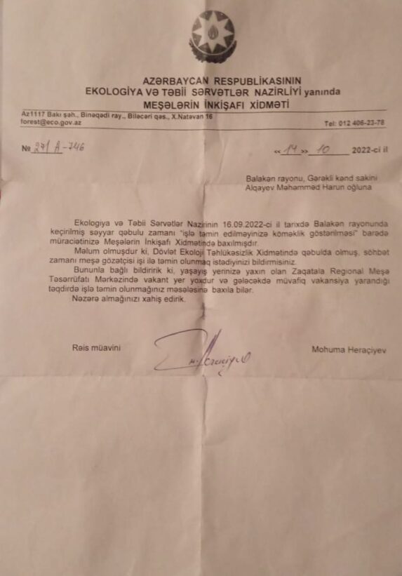 Şikayətçi deyir ki, bundan sonra Ekologiya və Təbii Sərvətlər Nazirliyinə gedib: “Orada məni bir qadın qəbul etdi. Əsəbiləşdim ki, məktubuma cavabda başqa səbəb göstərmisiniz, amma yenə istədiyim işə adam götürmüsünüz. Dandılar ki, heç kimi götürməmişik. Orada da Balakən Rayon İcra Hakimiyyətinə zəng etdilər ki, işlə bağlı mənimlə əlaqə saxlasınlar. Oradan da xəbər çıxmadı. Ancaq İcra Hakimiyyəti təzəlikcə nazirliyə müraciət göndərdi, hələ cavab yoxdur”.
