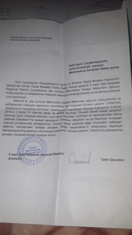 “Ailə 6 nəfərdən ibarətdir. Ailənin əmək qabiliyyətli üzvü Məmmədov İsmayıl hazırda işsizdir. Sözügedən şəxsin məşğulluğu təmin edildikdən sonra müraciət edərsə, ailənin sosial yardımla bağlı müraciətinə baxıla bilər”.