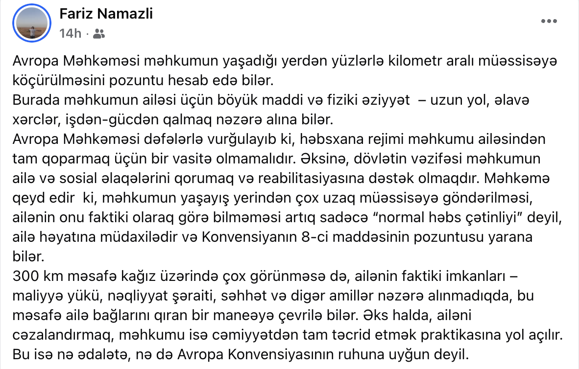 Vəkil Fariz Namazlı “Facebook” səhifəsində yazıb ki, Avropa İnsan Hüquqları Məhkəməsi (AİHM) vaxtilə məhbusların yaşayış yerlərindən uzaq məsafədəki müəssisələrə köçürülməsini qanunsuz sayan qərarlar verib.