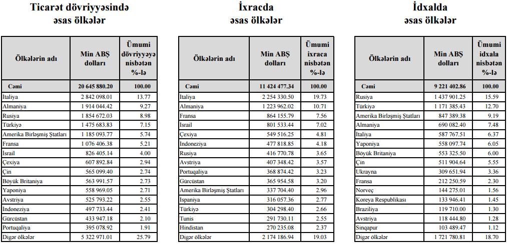 Beləliklə, ixrac-idxal əməliyyatlarımızın böyük bir hissəsi Avropa Birliyi ölkələrinin, ABŞ, Türkiyə və İsrailin payına düşür, Rusiya bizdən cəmi 416 mln. dollarlıq mal alır, amma ölkəmizə 1,43 mlrd. dollarlıq mal satır, yəni, ticarət saldosunda Rusiya 1.1 mlrd. dollar üstünlüyə malikdir. Başqa sözlə desək, Rusiya Azərbaycandan 1,1 mlrd. dollar pul qazanır, onlar üçün bu daha sərfəli və maraqlı əlaqələrdir.