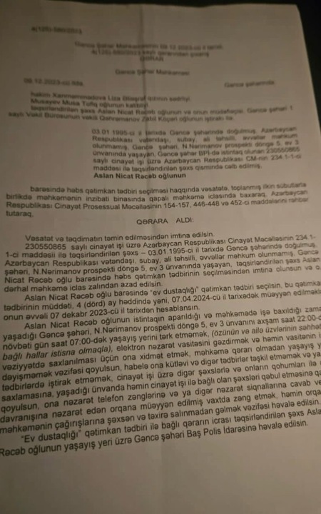 Bu işə Gəncə Apelyasiya Məhkəməsində hakim Rafiq Cəfərov baxıb. O, aşağı instansiya məhkəməsinin qərarını ləğv edib, onun haqqında ilkin istintaq dövrü üçün 4 aylıq həbs qətimkan tədbiri seçilib: