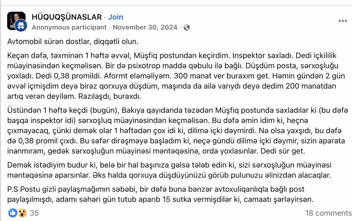 Bəzi sürücülər bildirir ki, əvvəllər alkoqol müayinəsində yol polisinin yol verdiyi pozuntular narkoloji müayinələrdə də davam edir və narkotik yoxlamaları ilə bağlı məsuliyyət daha yüksək olduğu üçün rüşvətin miqdarı da artıb.