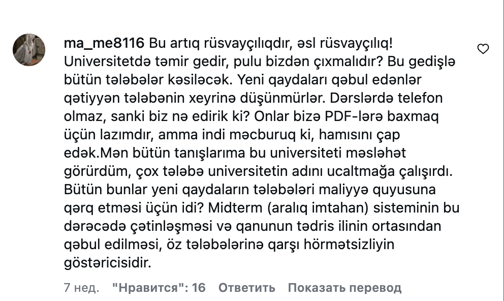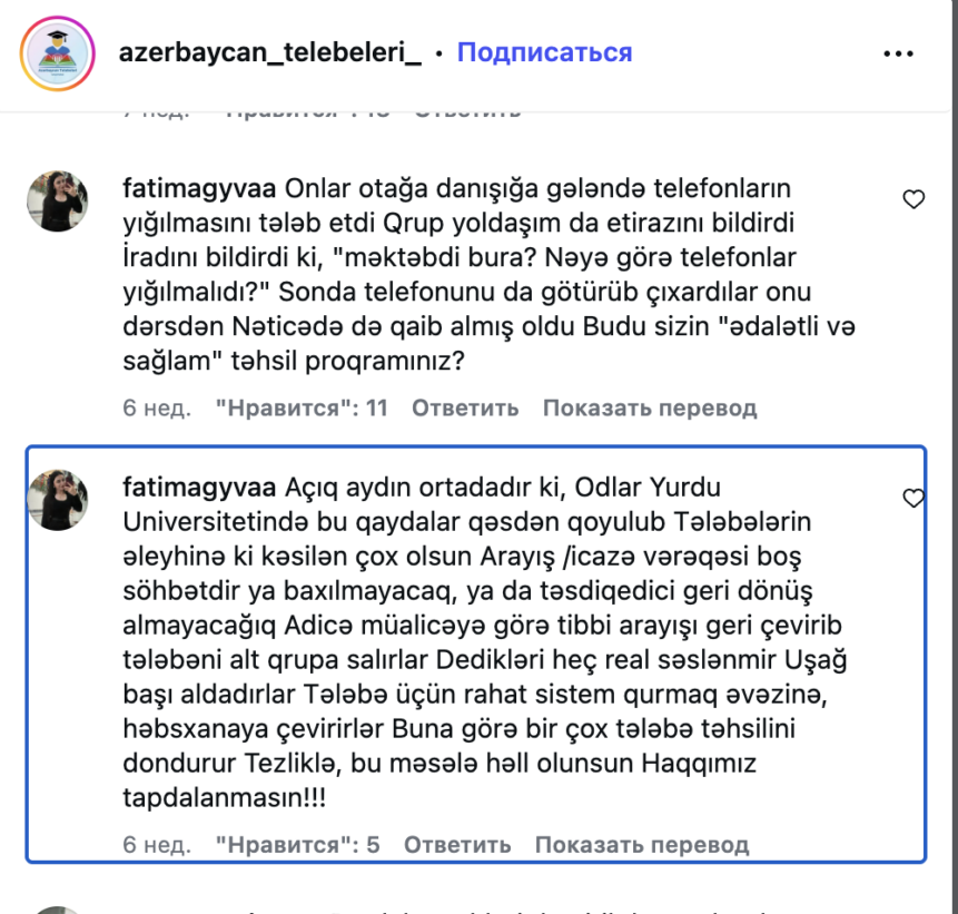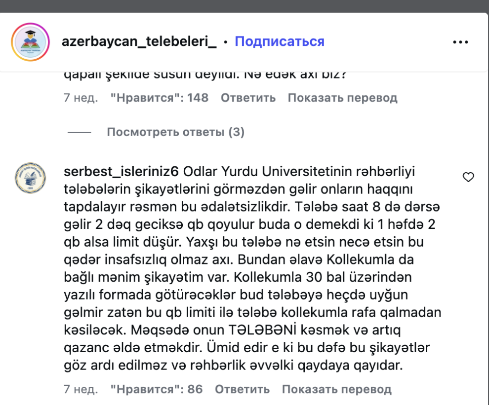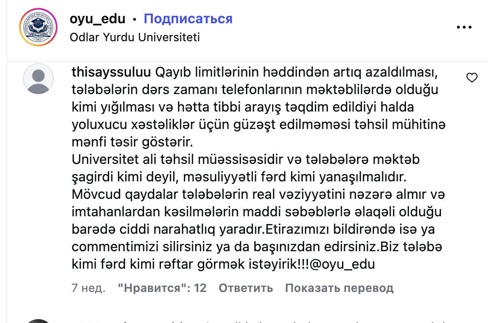 Tələbələr şərhlərində qeyd edirlər ki, hər hansı narazılıq bildirəndə rəhbərlik tərəfindən “xoşun gəlmir, sənədlərini götür get” kimi cavablar alırlar. Həmçinin universitet tərəfindən sosial mediada yazılan tənqidi rəylərin silindiyi iddia olunur.