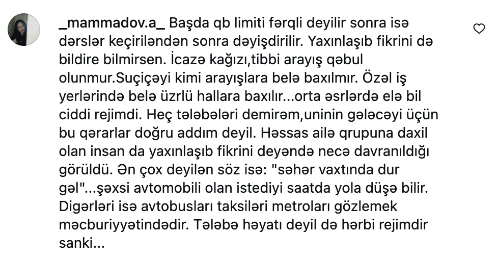 Tələbələr şərhlərdə universitetdəki şəraiti “hərbi rejim” və ya “həbsxana”ya bənzədir. Onlar yetkinlik yaşına çatmış şəxslərə məktəbli kimi yanaşılmasından və valideyn nəzarəti tələblərindən şikayətçidirlər.